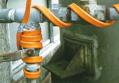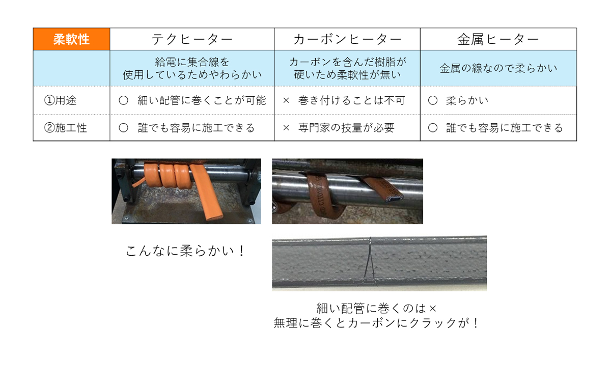 非常に柔らかく、段差や複雑な配管・継手への施工も容易です。100V仕様と200V仕様があり、100V用は電源プラグがついているので、家庭用のコンセントに差し込みだけで使うことが出来ます。