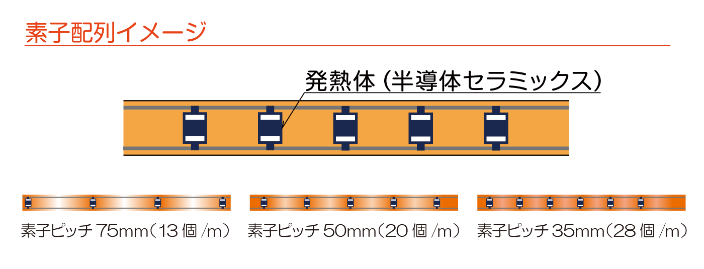 | 品番 | 長さ (m) | 電力(W) | 素子ピッチ (mm) |