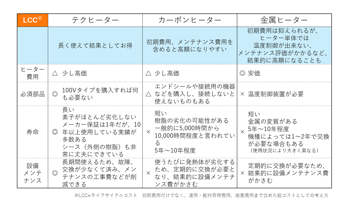 つまり、高い耐久性を持つテクヒーターは⾧い目で見るとコストパフォーマンスも抜群です。