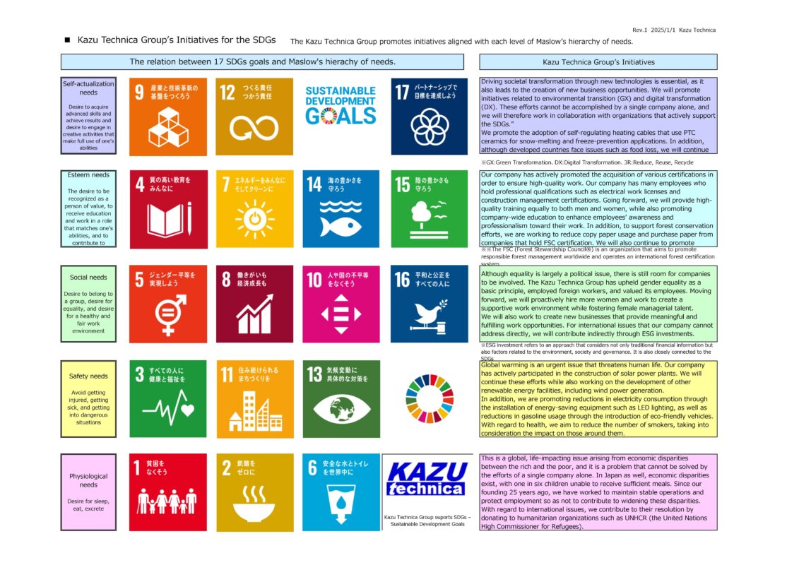 The Kazu Technica Group supports the United Nations–recommended Sustainable Development Goals (SDGs). As shown on the separate sheet outlining each SDG goal, we promote initiatives aligned with each level of Maslow’s hierarchy of needs. Our activity results will be disclosed on an ongoing basis.”
